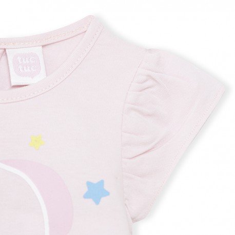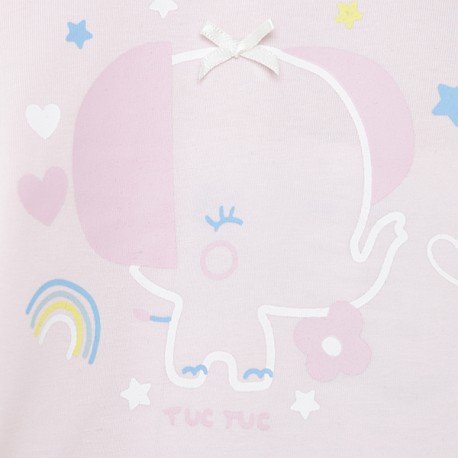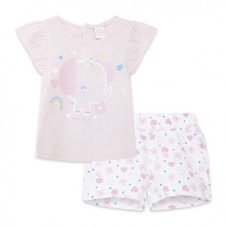 Conjunto camiseta y short niña. Camiseta manga corta rosa con dibujo frontal de elefante y short blanco con estampado de corazones y flores y volantes en parte trasera de la colección So Cute
