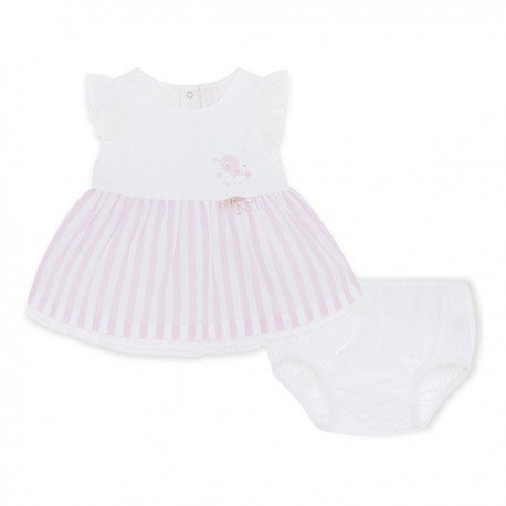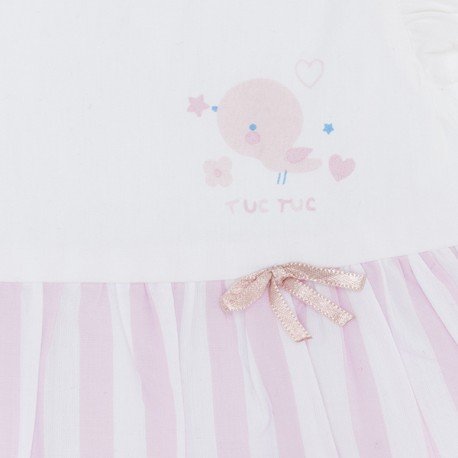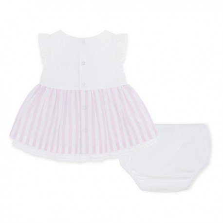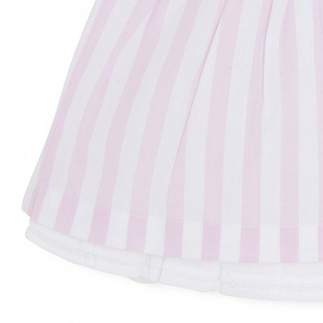 Vestido algodón sin mangas con braguita niña blanco con volante y parte inferior a rayas rosas y blancas de la colección So Cute