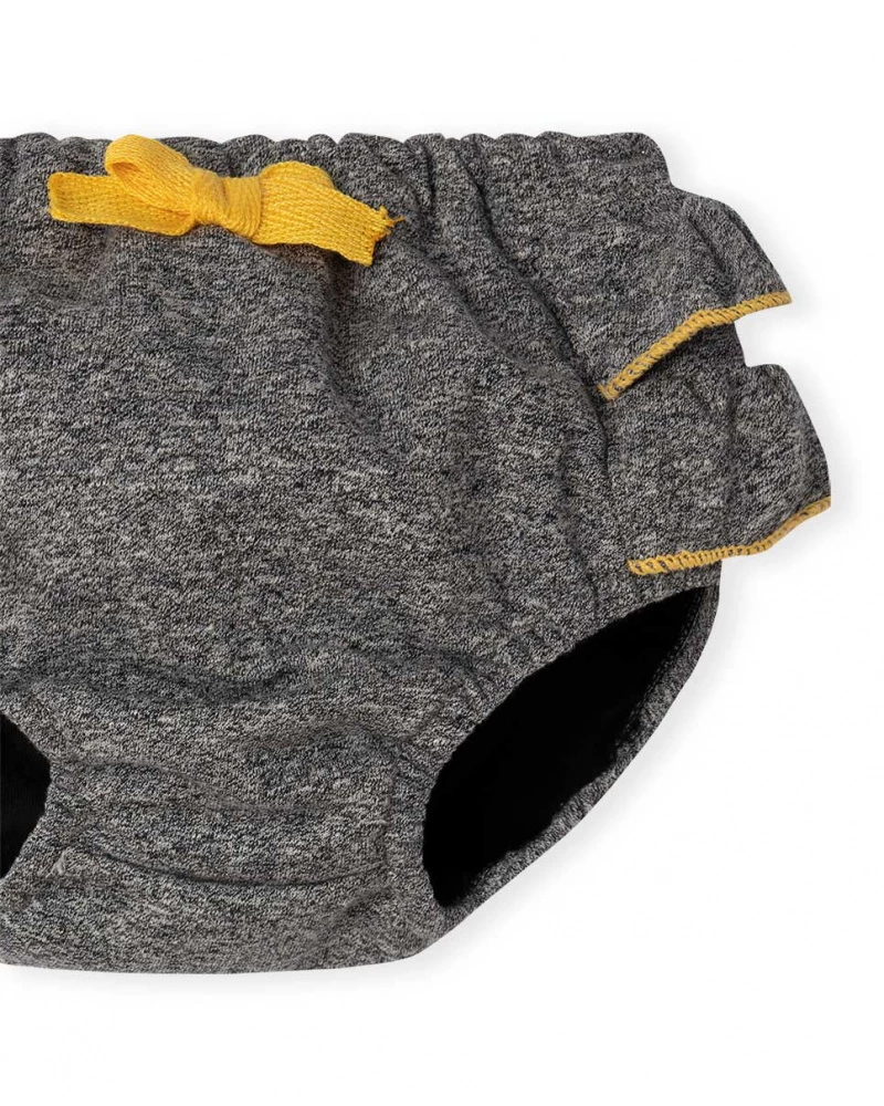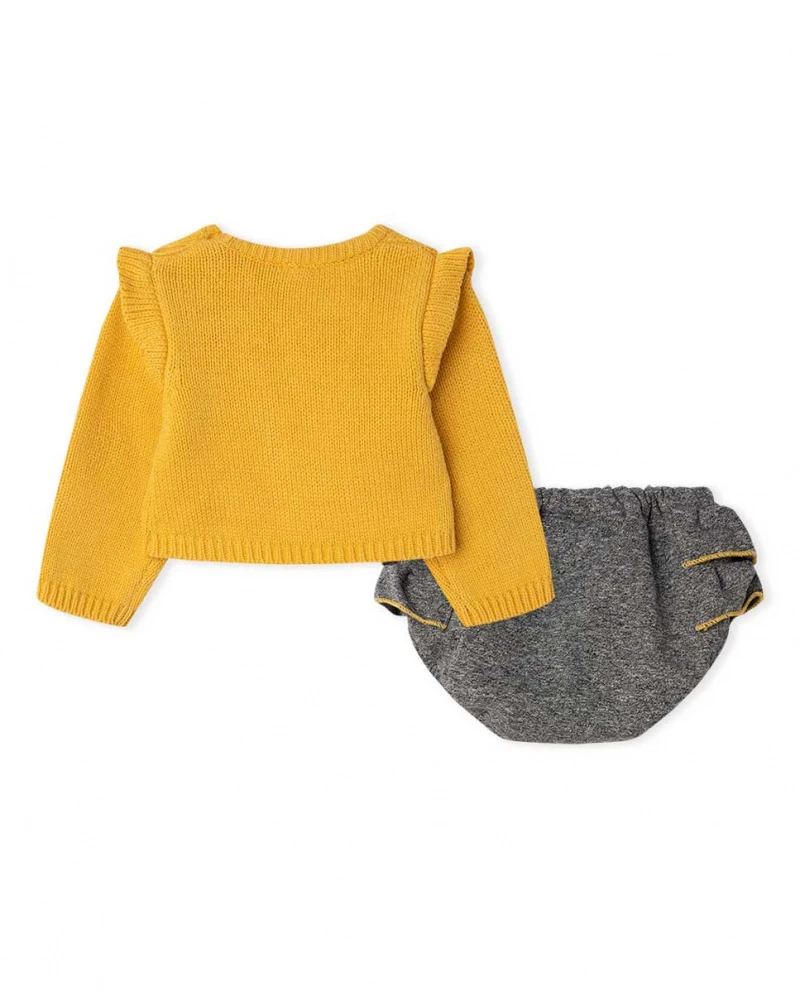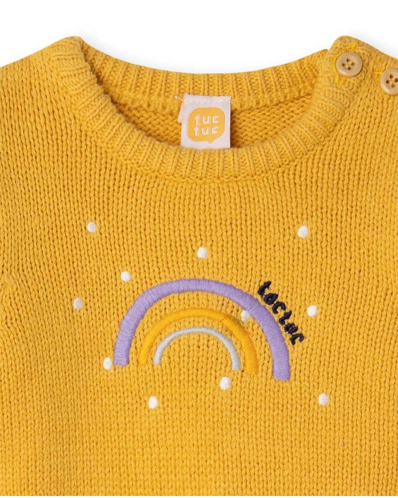 Jersey tricot con estampado de arcoiris de color rosa y un color base de color naranja y ranita felpa de niña color gris con cordon de ajuste.