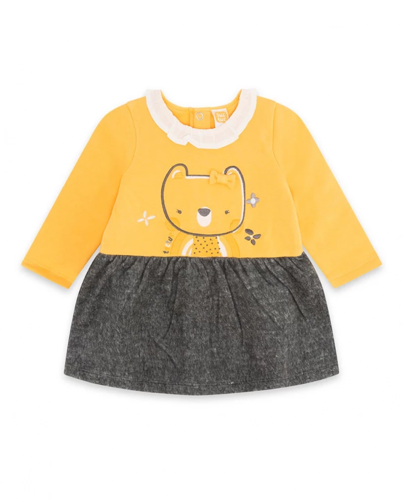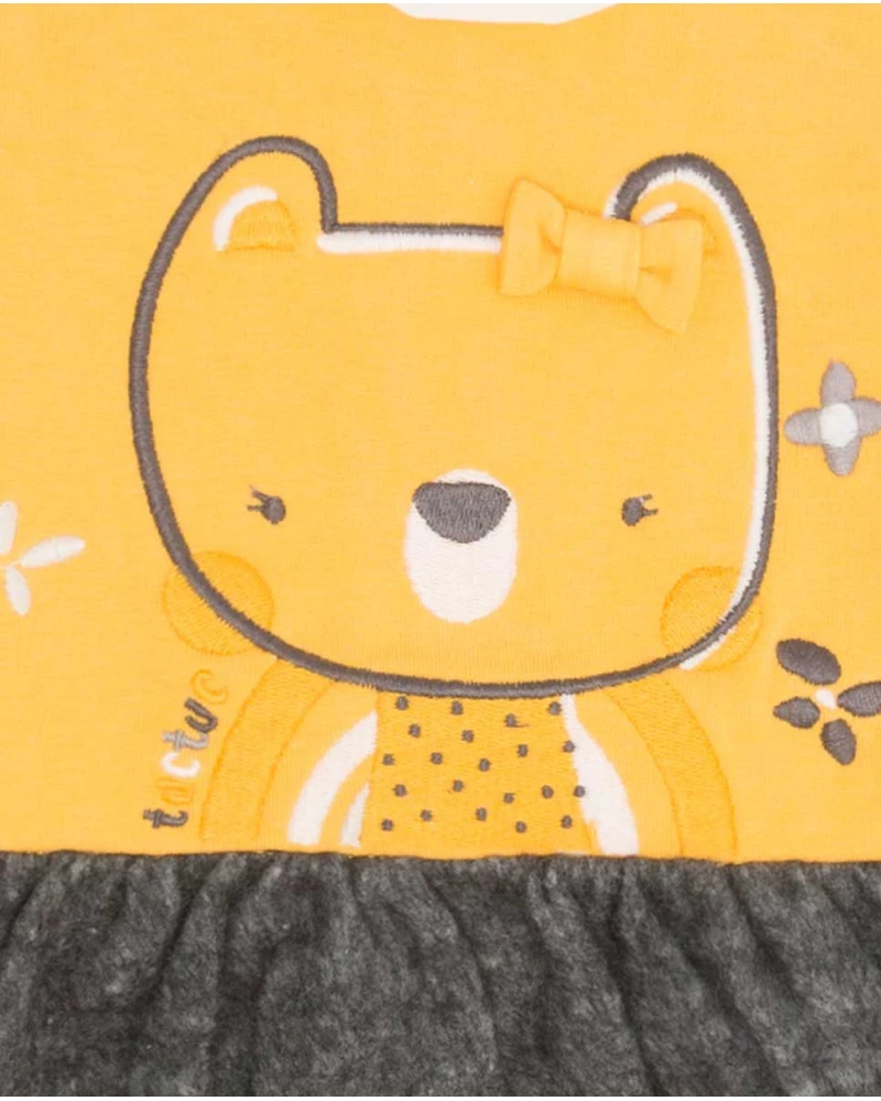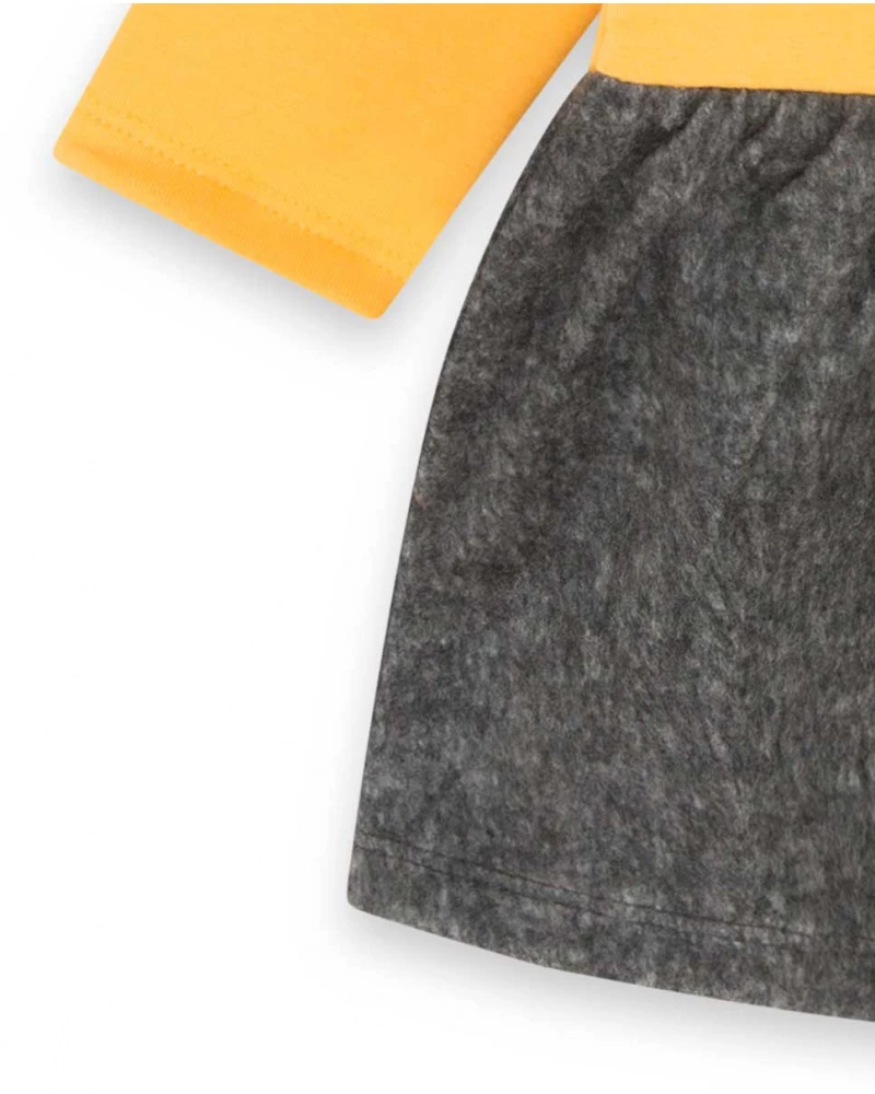 Vestido felpa de niña con un estampado de animal con base naranja y gris, con botones a presión en la parte trasera.