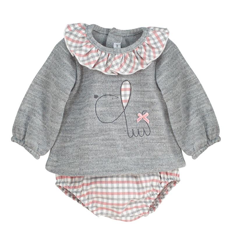 Conjunto bebé niña de dos piezas, jersey sudadera con volante estampado de cuadros en cuello y abertura en espalda, con pololo con mismo estampado. FABRICADO EN ESPAÑA.