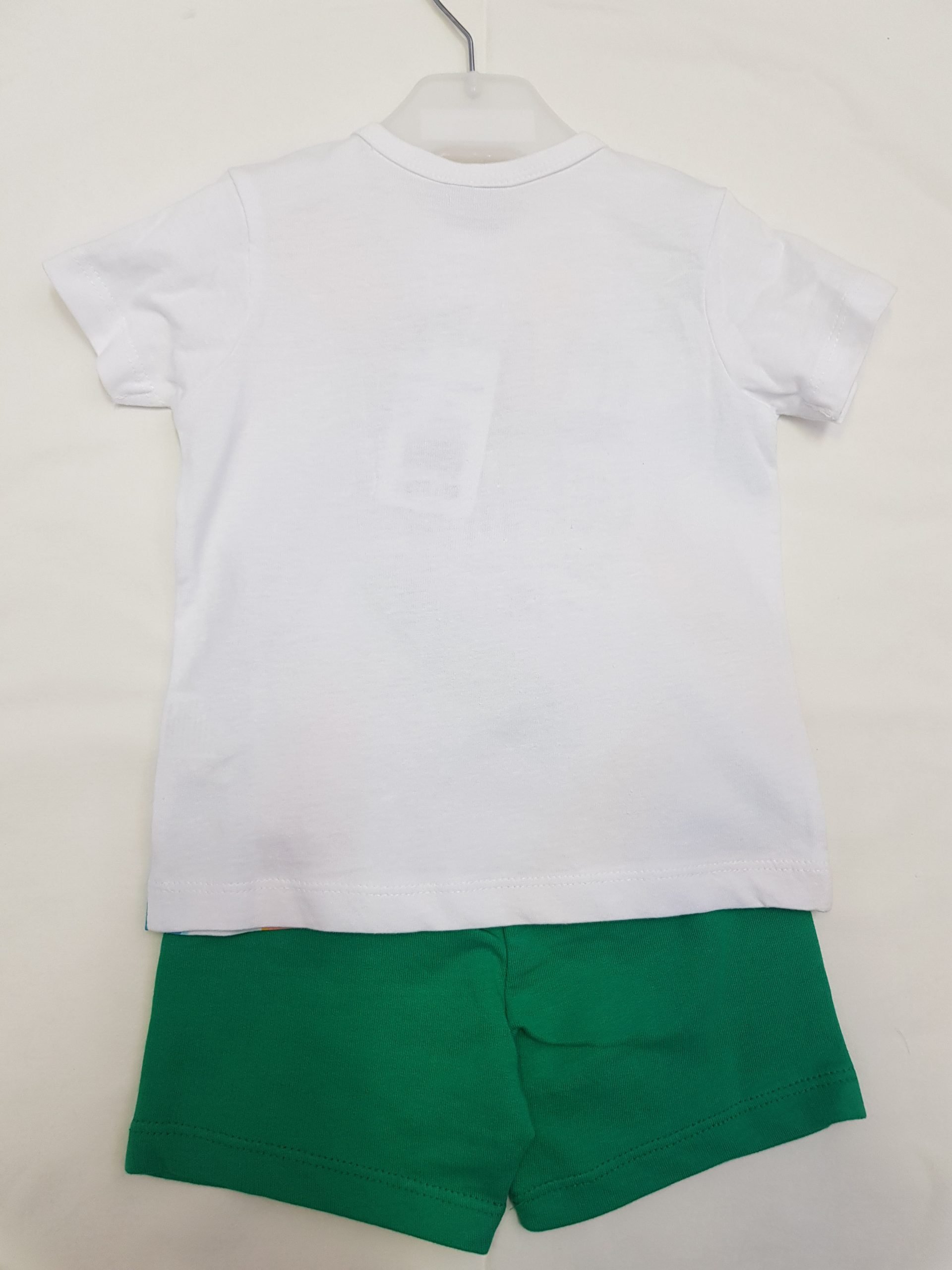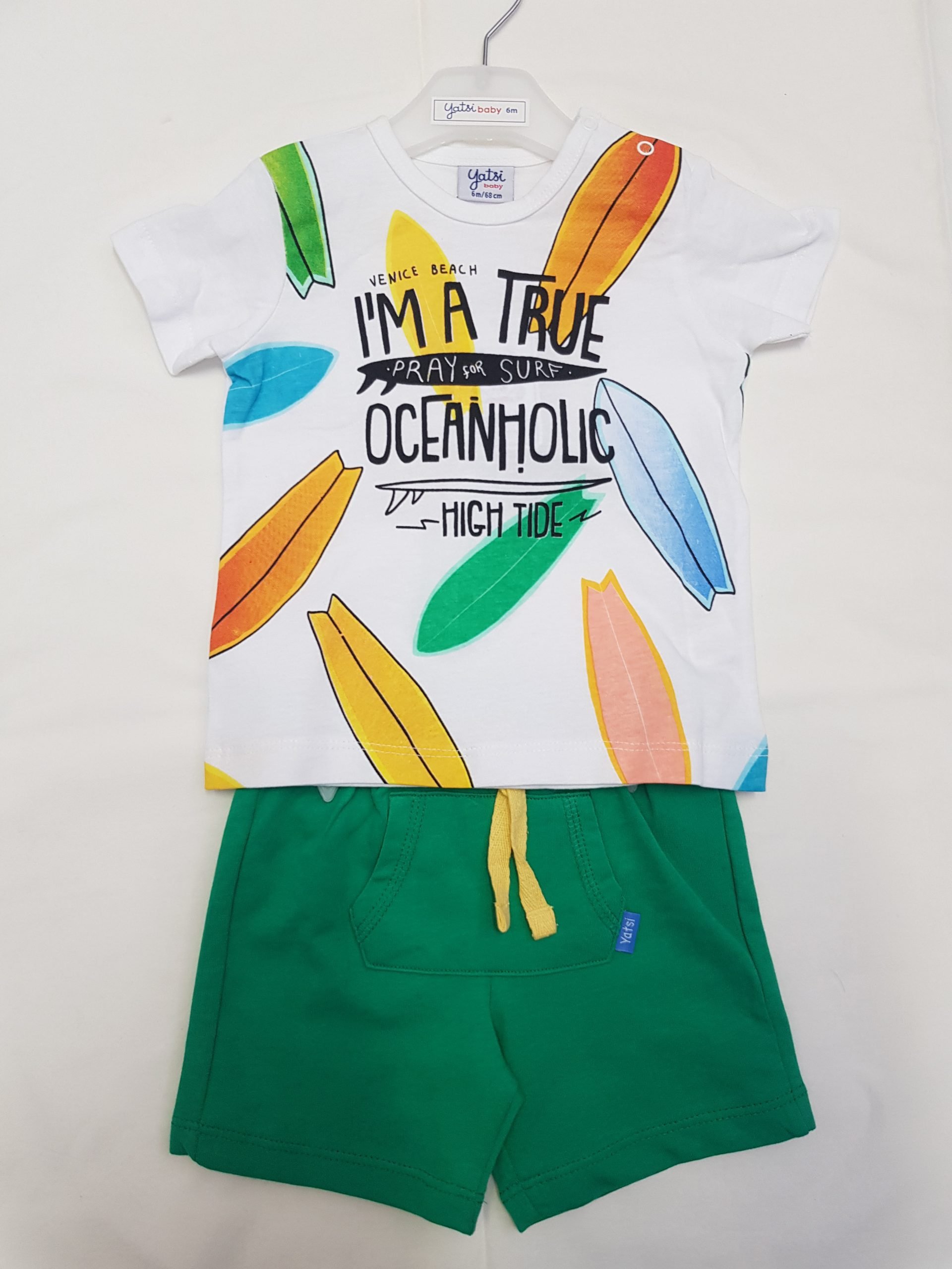 CÓMODO CONJUNTO COMPUESTO POR PARTALON CORTO VERDE Y CAMISETA BLANCA ESTAMPADA CON TABLAS SURF. 100% ALGODÓN.
