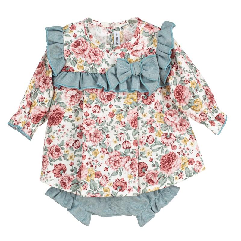 Jesusito bebé niña con estampación floral, volante canesú combinado a juego con braguita. Abertura trasera mediante botones.