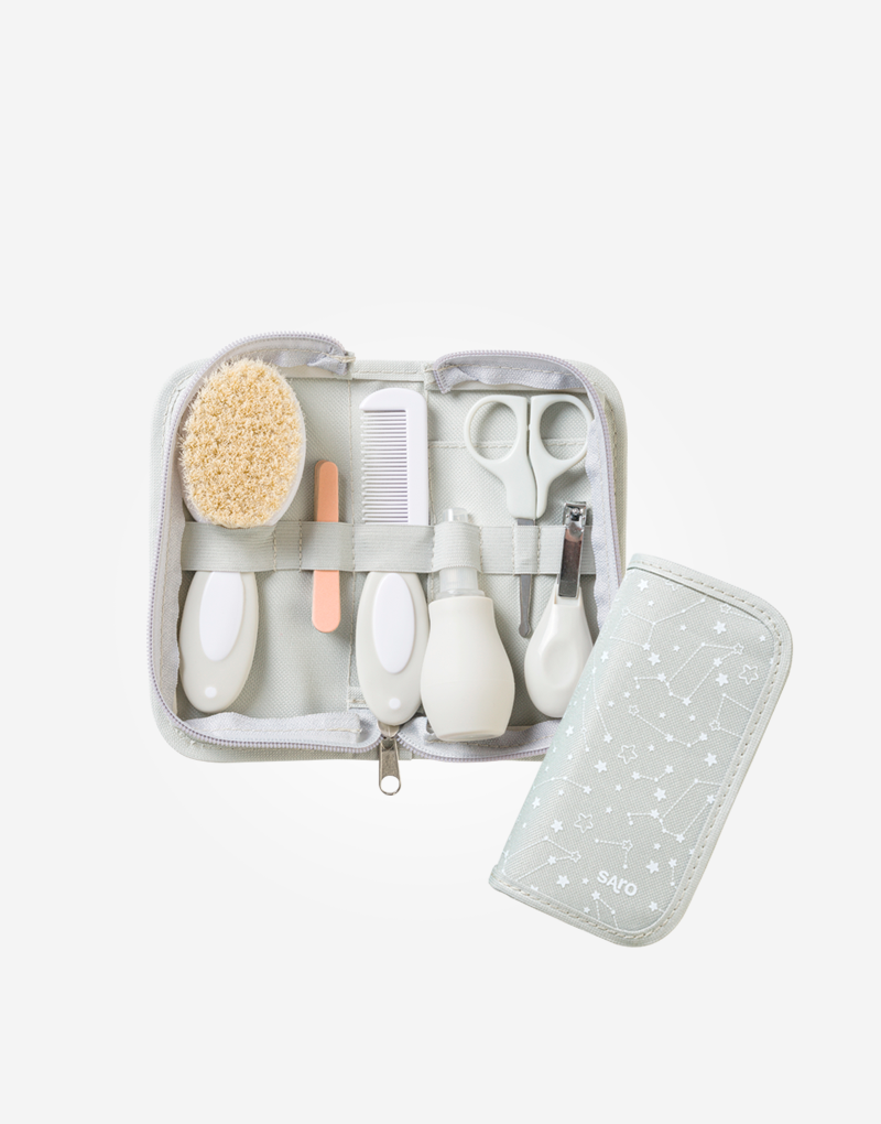 Completo neceser con todo lo necesario para el aseo del bebé en un práctico estuche con cremallera.