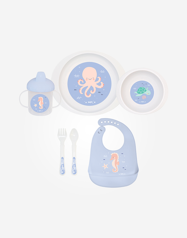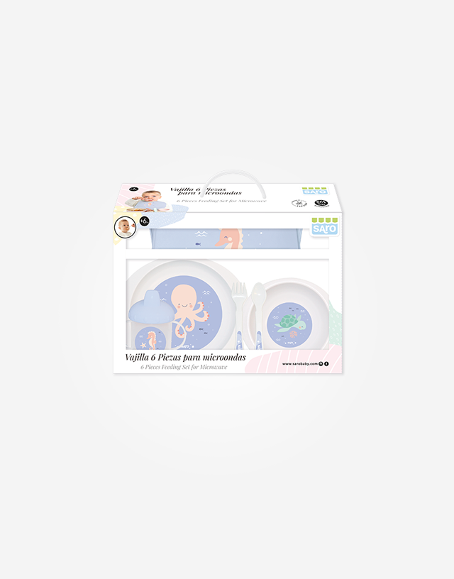 - Compuesta por: plato, bol, taza antigoteo con dos asas y tapa, babero de silicona, cuchara y tenedor.