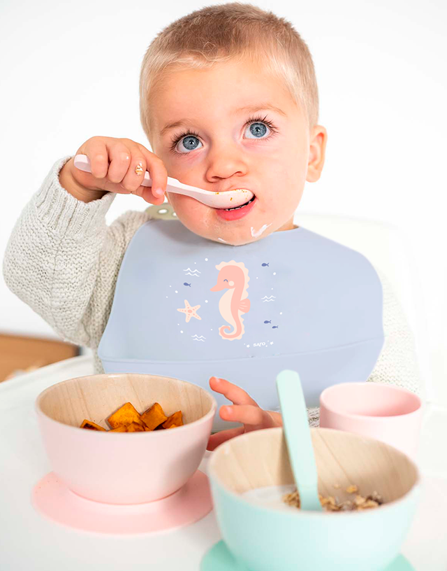 Tu peque limpio y seco gracias a este babero de silicona con recogemigas. Perfecto para BLW y muy resistente. ¡Limpieza superfácil!