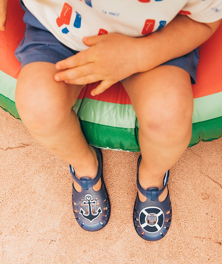 Cangrejera clásica traslúcida con cierre adherente y motivos náuticos. Made in Spain.