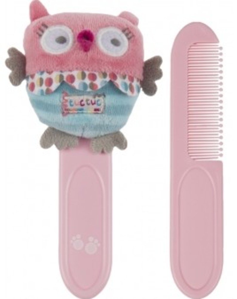 Juego compuesto de cepillo y peine, de la colección magic forest de tuc tuc. Este peine de púas finas y cepillo con cerdas muy suaves, permiten peinar la cabecita de tu bebé sin hacerle daño alguno. Mango ergonómico para poder manejarlo fácilmente. Divertido peluche de señor búho en tonos rosa.
