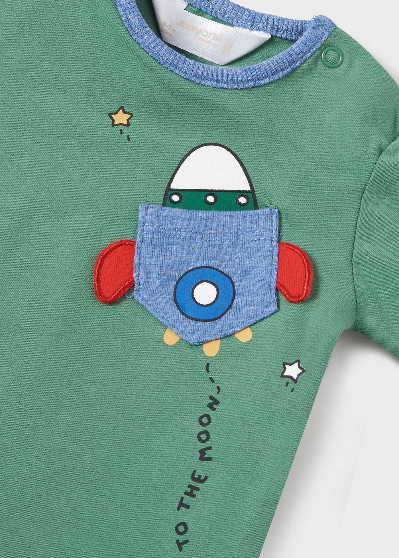Camiseta de manga corta para recién nacido niño. Cuello redondo en distinto color. Cierre con un único botón a presión. Cómodo tejido de punto. Bolsillo funcional en la parte delantera.