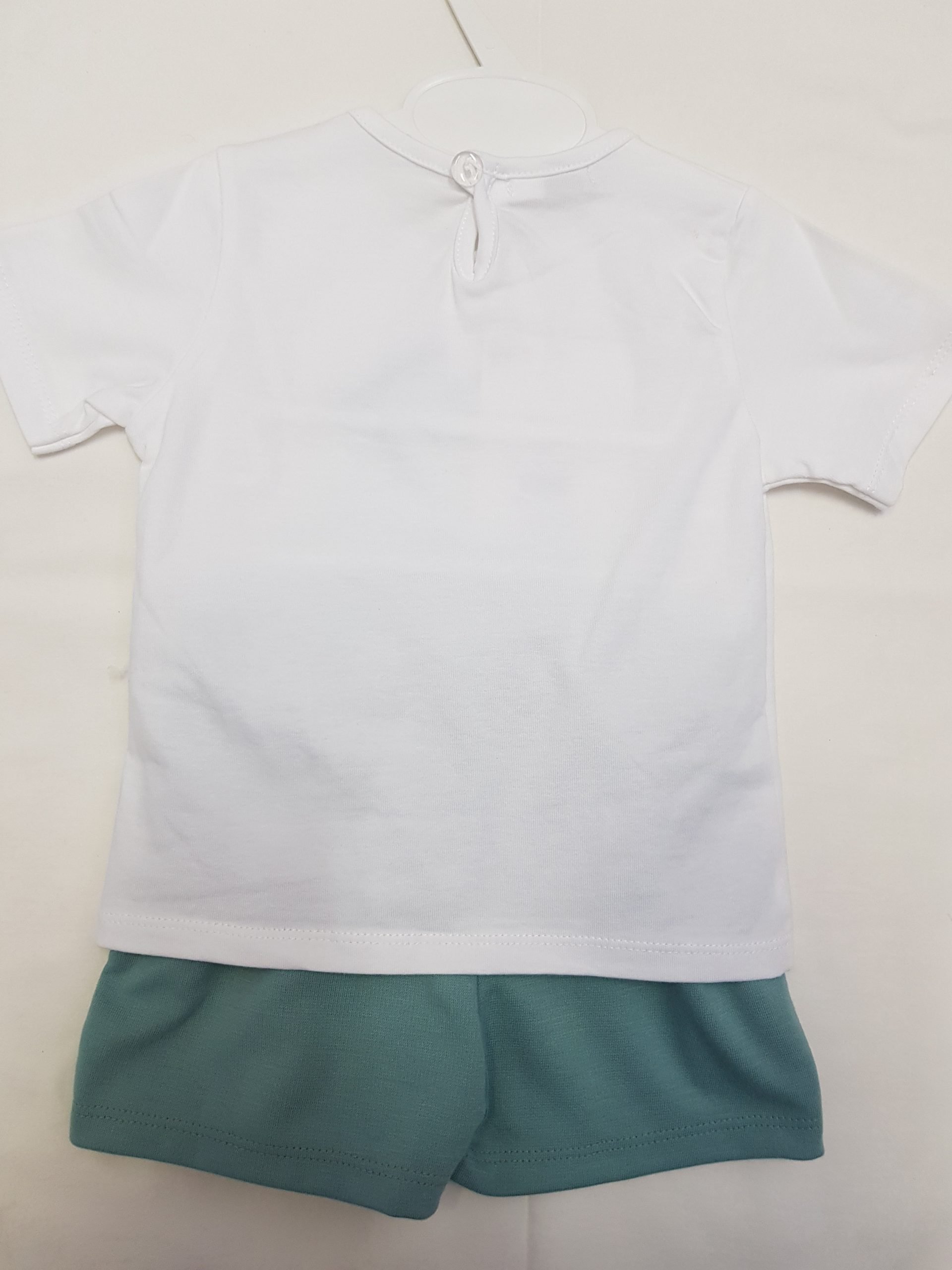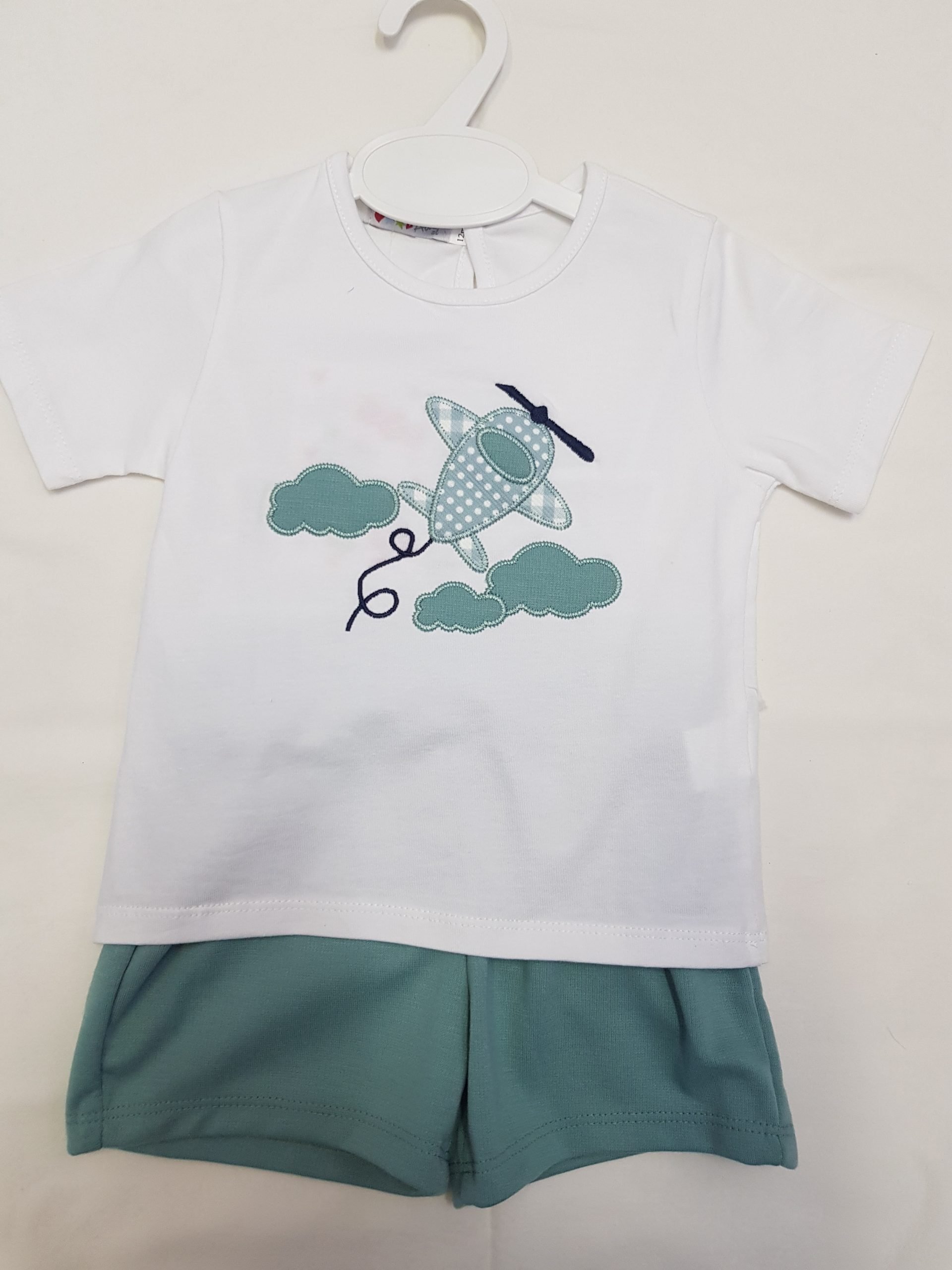 CONJUNTO PANTALÓN CORTO COLOR VERDE Y CAMISETA BLANCA CON DETALLE AVIÓN. 90% ALGODÓN / 10% EA.