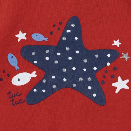 Conjunto niña camiseta y short. Camiseta de manga corta y cierre con botones en la espalda , en color rojo y dibujo frontal de estrella de mar. Short a rayas horizontakes blancas y azul marino y cintura ajustable con cordón. Colección Little Pirates