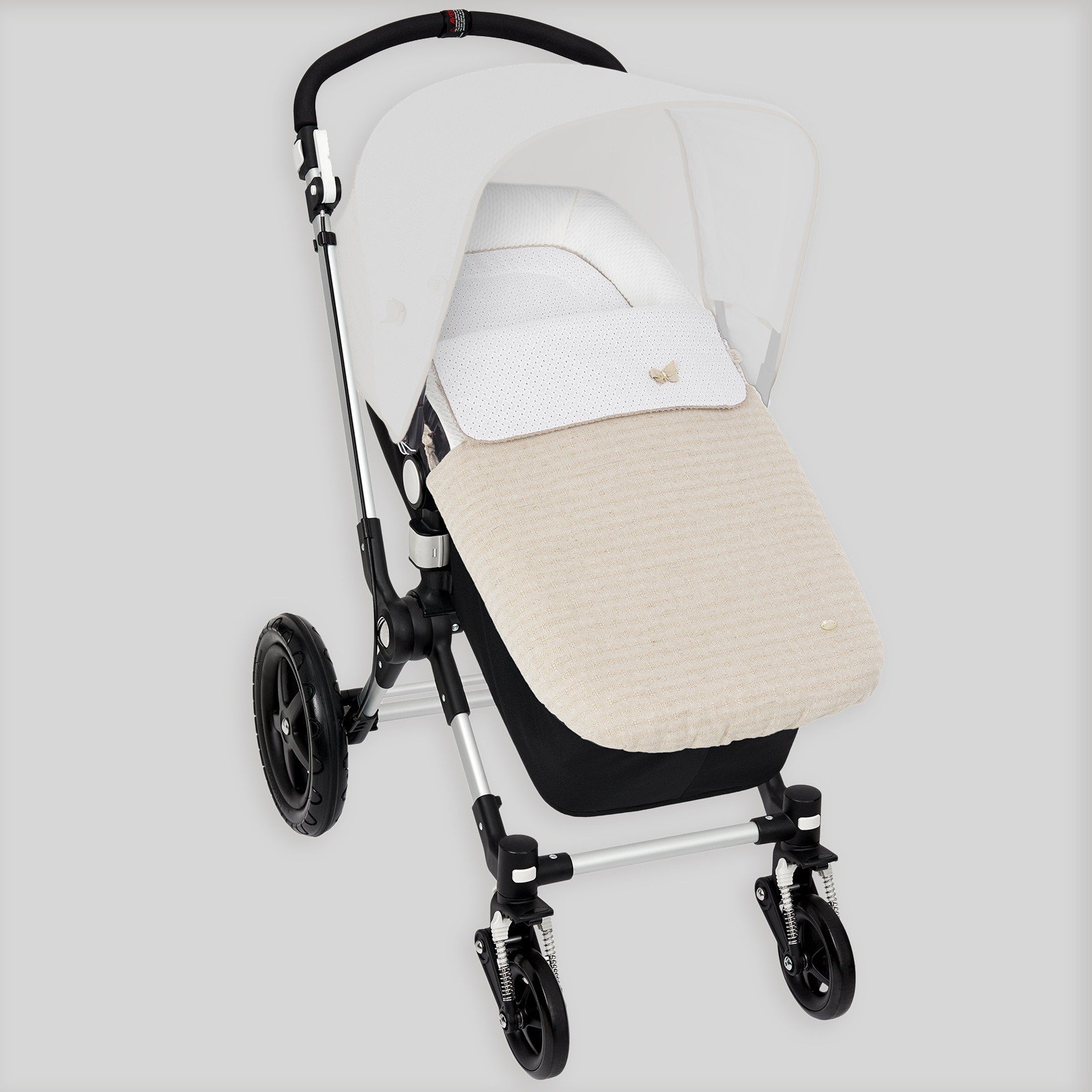 Conjunto Colcha ajustable confeccionada en lino y algodón con aplicación de tejido bordado en embozo. Lleva un elástico en la parte inferior y se adapta a casi todos los capazos del mercado.