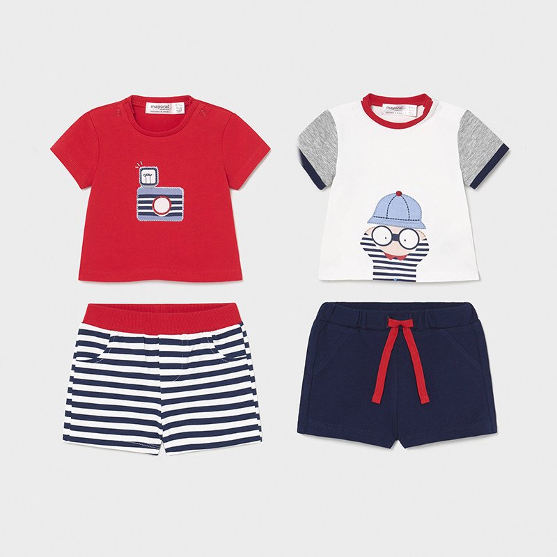 Set de cuatro piezas para recién nacido niño de 0 a 18 meses formado por dos conjuntos de camiseta de manga corta y short combinables. Suave tejido de algodón elástico.