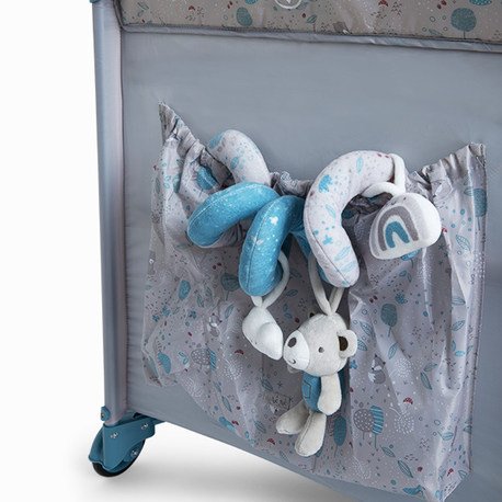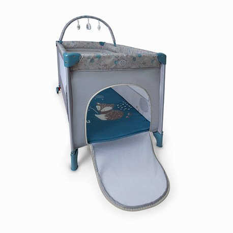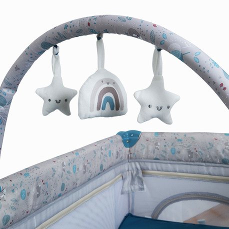 ‘-Estructura metálica con revestimiento de poliéster estampado a juego de colección. -Dos alturas del somier. -Ruedas con 2 frenos. -Plegado tipo paraguas. -Incluye gatera, bolsillo lateral y arco de juegos. -Incluye bolsa de transporte.