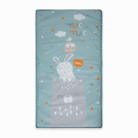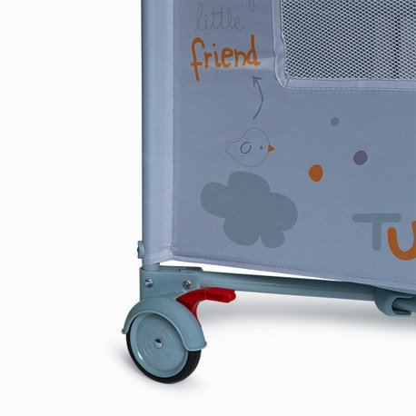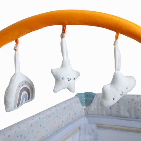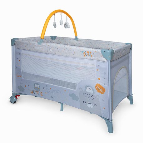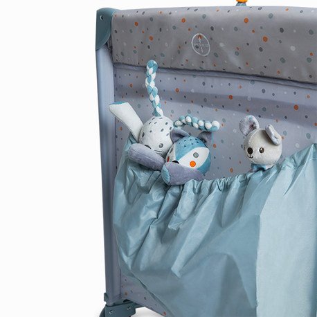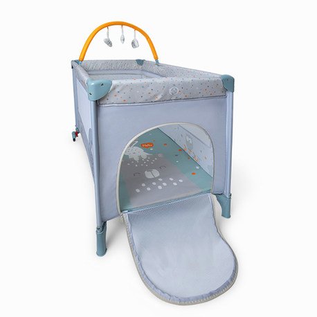 Estructura metálica con revestimiento de poliéster estampado a juego de colección. Dos alturas del somier. Ruedas con 2 frenos. Plegado tipo paraguas. Incluye gatera, bolsillo lateral y arco de juegos. Incluye bolsa de transporte.