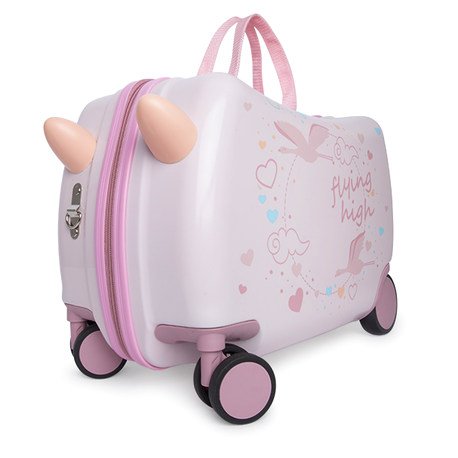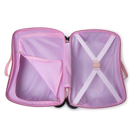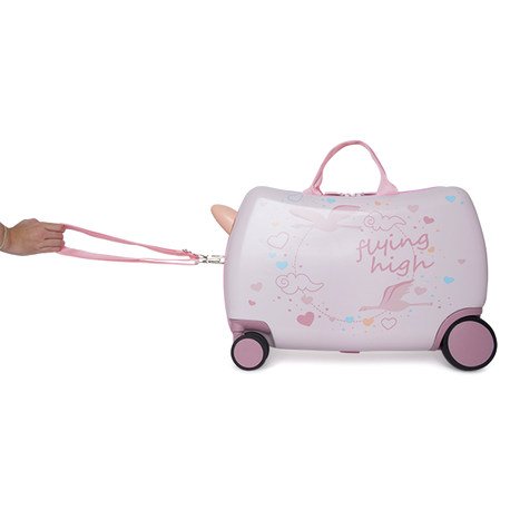 Una original y divertida maleta trolley en tonos rosas donde podrán subirse, correr y guardar sus propios juguetes cuando vayan de viaje, al parque o a casa de familiares y amigos. Se puede llevar de diferentes maneras: tirando de ella tipo Trolley, al hombro con la bandolera ajustable o montándose encima.