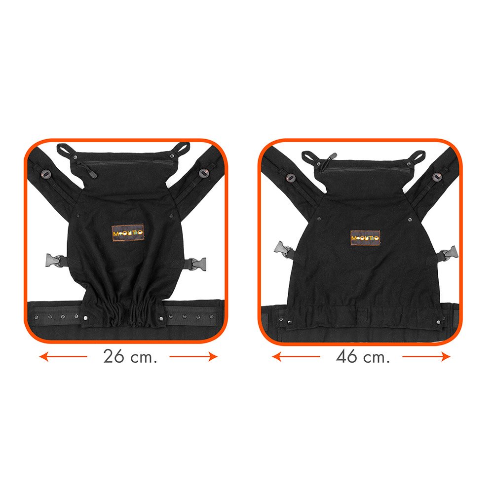 El Portabebés evolutivo Molto. Se ajusta al bebé gradualmente según va creciendo. Anchura mínima 26 cms. Anchura máxima 46 cms. Ajustable en altura. Capucha para dormir y mantener su cabecita. Soporte acolchado para la cabeza del bebé. Soporte lumbar. Algodón 100%.