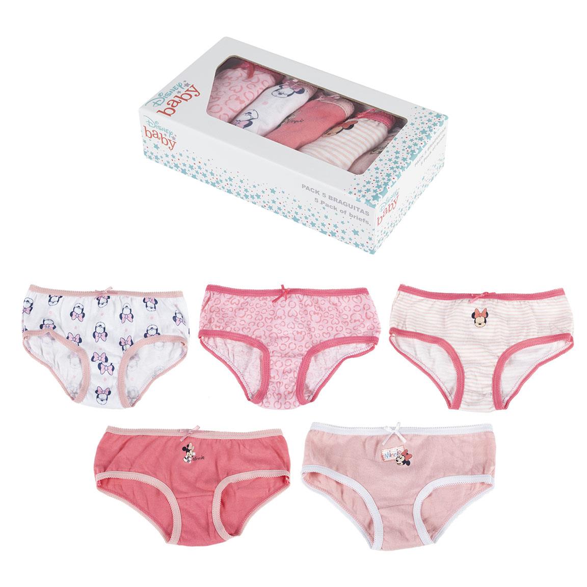 Pack de 6 braguitas para niñas de Minnie Mouse. Esta prenda está fabricada 100% en algodón, un material fresco, ligero y transpirable para la comodidad diaria de tu pequeña. Es un pack variado con braguitas de diferentes tonos de rosa, estilos y estampados.