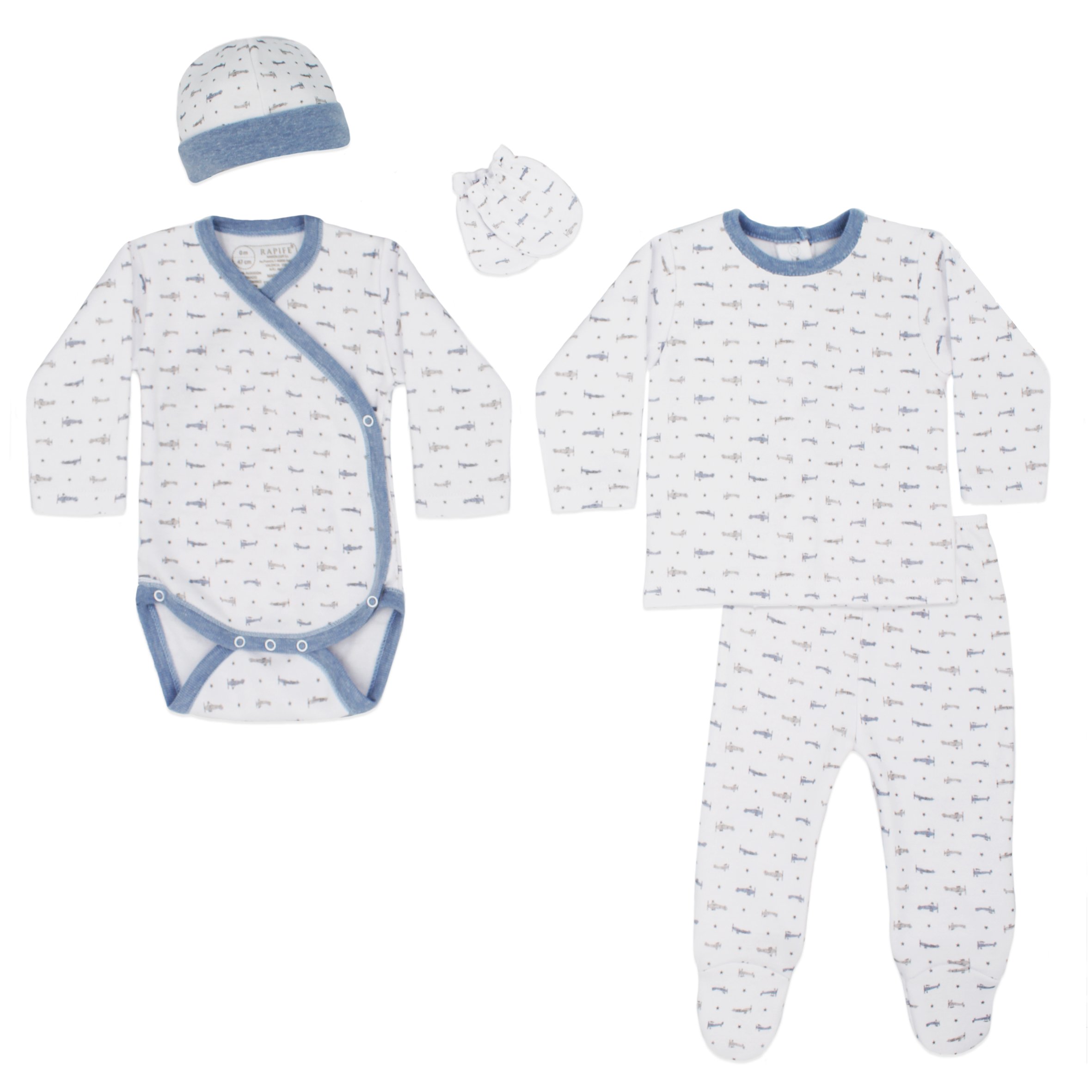 Pack de recién nacido estampado. Está compuesto por gorrito, manoplas, body abierto por delante de manga larga y un jesusito de dos piezas abrochado por la espalda mediante automáticos. Tejido de punto interlock 100% algodón peinado realizado en nuestras instalaciones. Pack recién nacido Rapife: 100% Made in Spain.