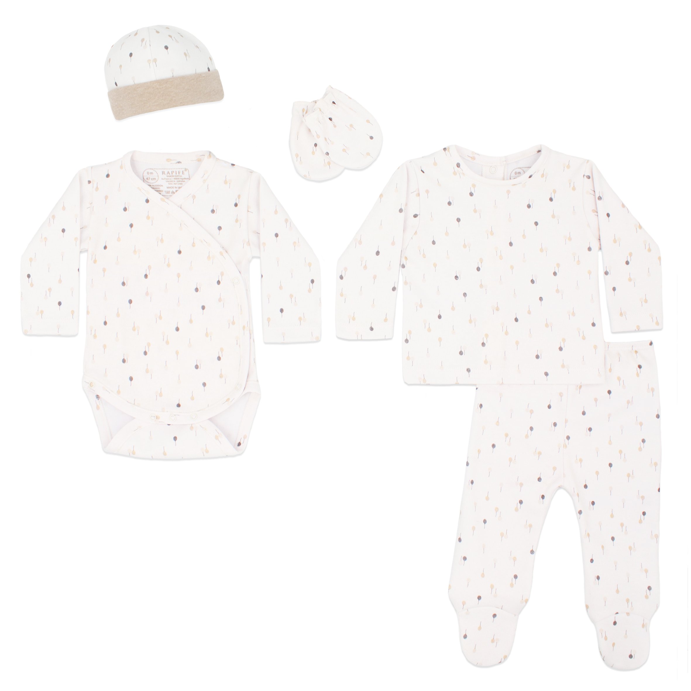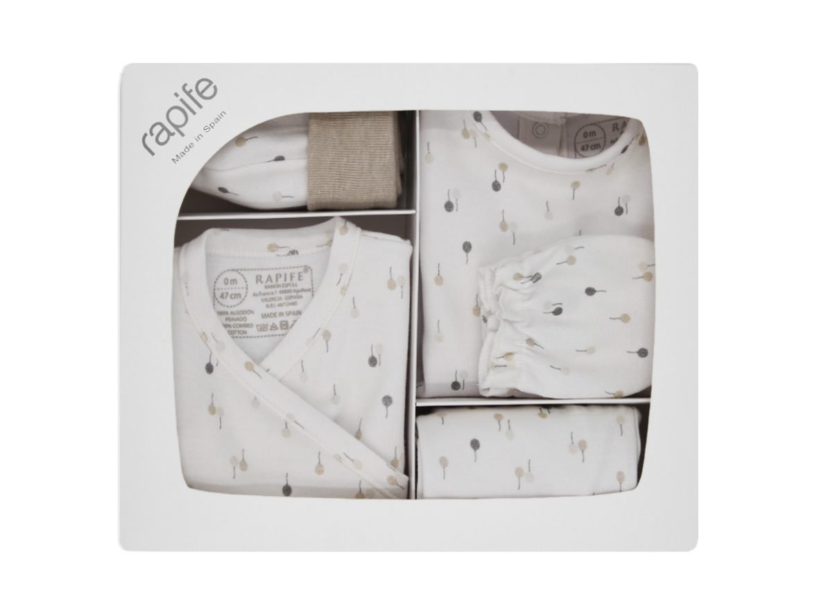 Pack de recién nacido estampado. Está compuesto por gorrito, manoplas, body abierto por delante de manga larga y un jesusito de dos piezas abrochado por la espalda mediante automáticos. Tejido de punto interlock 100% algodón peinado realizado en nuestras instalaciones. Pack recién nacido Rapife: 100% Made in Spain.