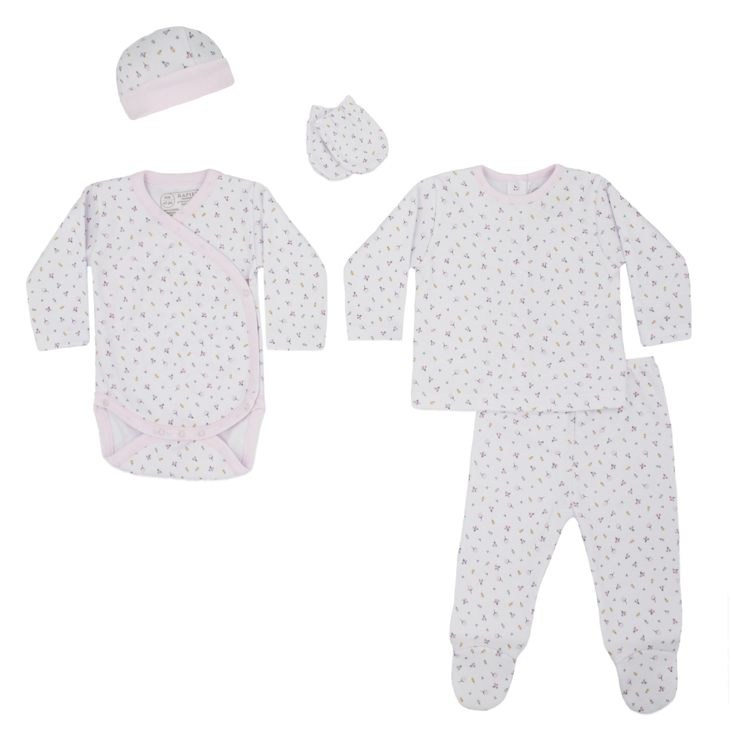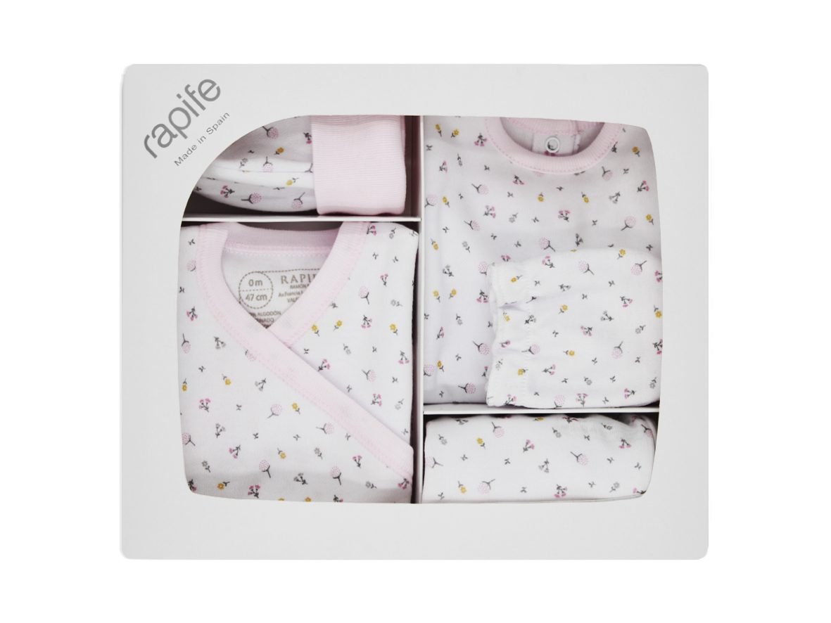 Pack de recién nacido estampado. Está compuesto por gorrito, manoplas, body abierto por delante de manga larga y un jesusito de dos piezas abrochado por la espalda mediante automáticos. Tejido de punto interlock 100% algodón peinado realizado en nuestras instalaciones. Pack recién nacido Rapife: 100% Made in Spain.
