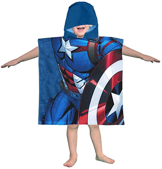 Poncho de Playa con capucha de Avengers, de fondo azul marino y estampado con dibujo del Capitán América en la parte delantera y en la espalda.