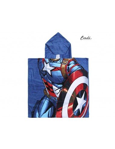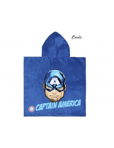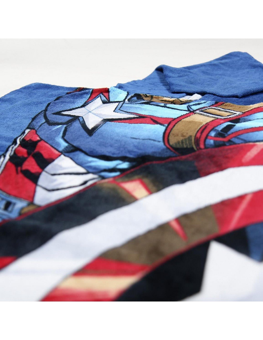 Poncho de Playa con capucha de Avengers, de fondo azul marino y estampado con dibujo del Capitán América en la parte delantera y en la espalda. Tacto de algodón suave que garantiza un secado rápido y sin pasar frío.