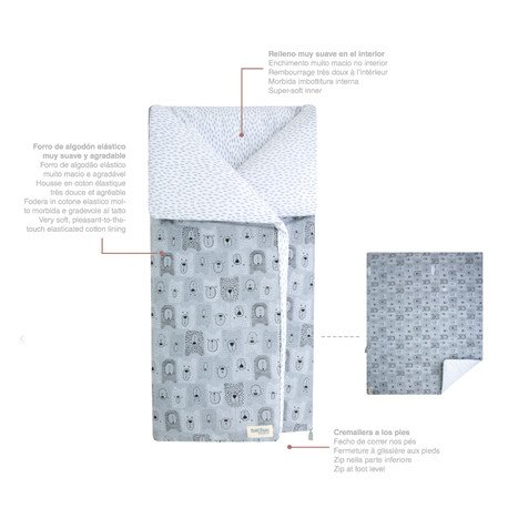 Saco arrullo adaptado a grupo 0 y capazo. Diseñado con un tejido elástico de algodón en su exterior y un interior cálido, suave y delicado. Al abrirlo completamente se convierte en una colcha y es apto para capazos y cunas. Apertura por la parte de los pies con cremallera. Dispone de velcros en los laterales para que el bebé no se desabrigue con el movimiento.