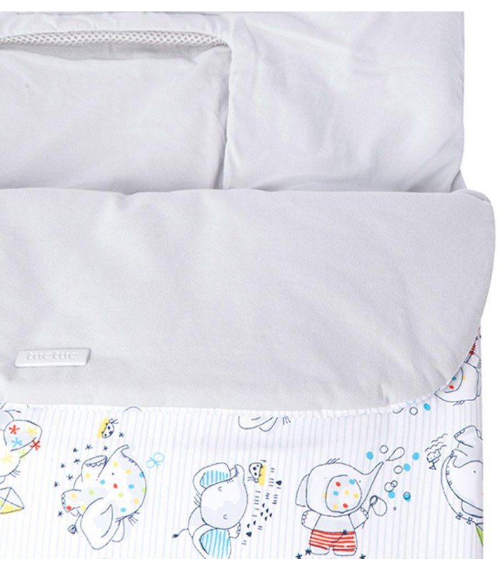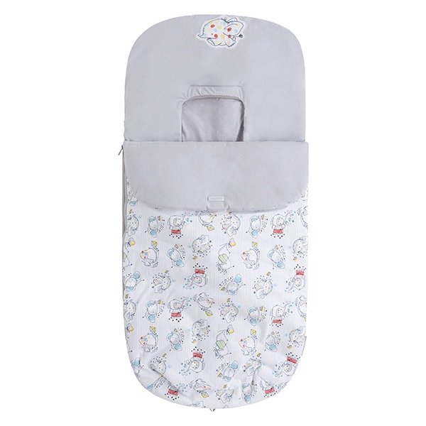 Saco de primavera para la silla de paseo de la marca Tuc Tuc en tonos grises y con motivo de elefantes y rayas. Modelo universal adaptable a la mayoría de sillas. Incluye aberturas para extraer el arnés. Cremallera para quitar la parte superior. Protector en la zona de los pies.