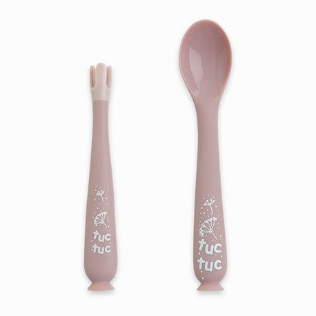- Cuchara de silicona y tenedor ergonómico con puntas redondeadas para facilitar el aprendizaje del niño