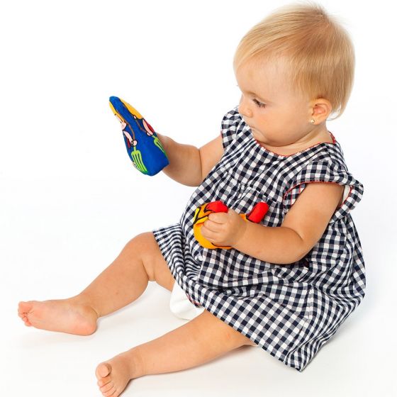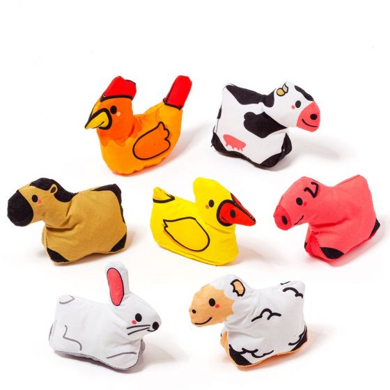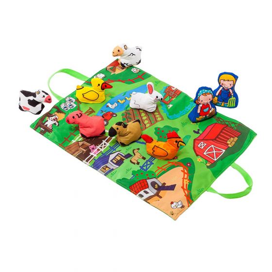 Coloca a cada animal en su espacio, aprende sus nombres, toca y experimenta con sus diferentes sonidos y colores y una vez que termines recoge tus juguetes en el mismo tapiz que se convierte en bolsa.
