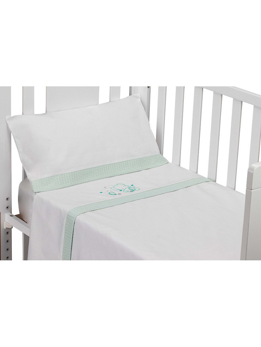 Juego de Sábanas Cuna 100% algodón – Modelo Conejo Elefante, Blanco y Menta.