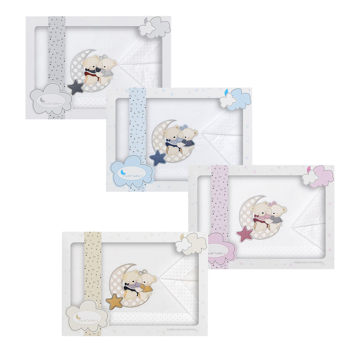 Conjunto de sabanas de algodón . embalaje de el producto en caja . contiene tres piezas encimera bajera y funda de el cojín . marca Interbaby.