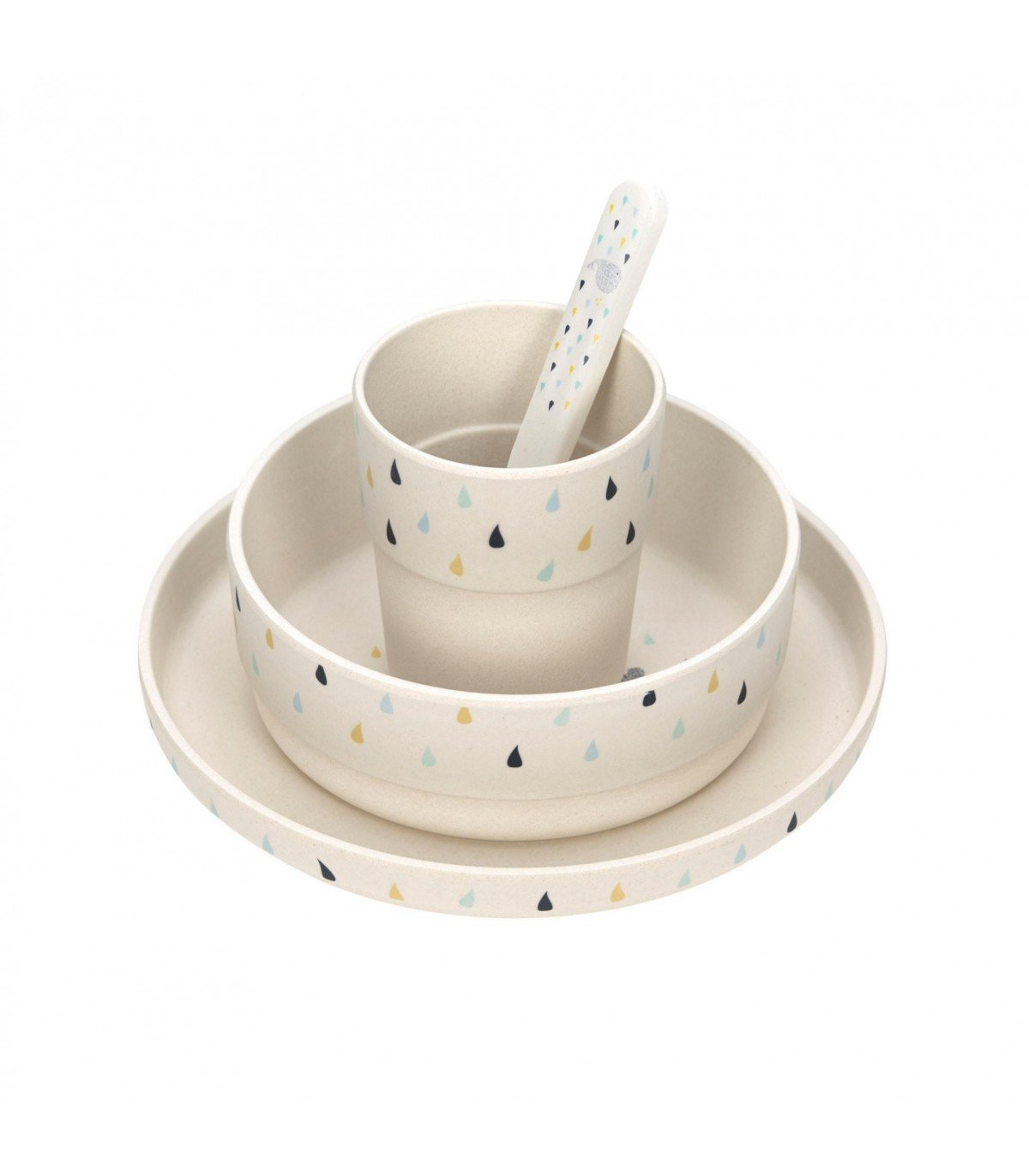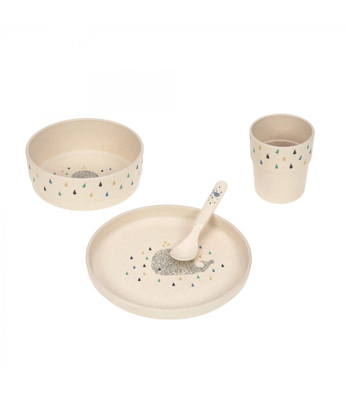 Conjunto de vajilla fabricada principalmente a base de materiales sostenibles suaves al tacto. Perfecta a partir de 6 meses y apta para lavavajillas.
