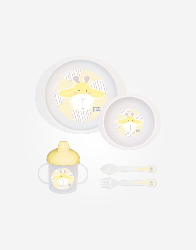 Compuesta por plato, cuenco, taza antigoteo con dos asas, cuchara y tenedor.
