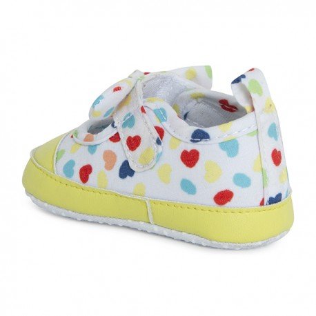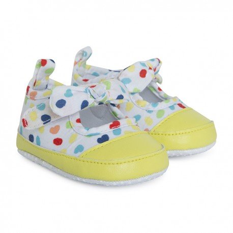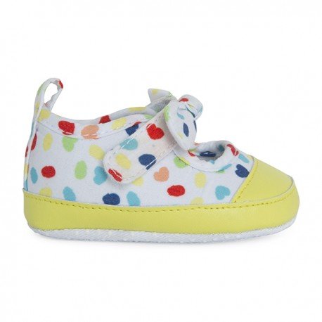 Zapatitos de algodón de bebé niña en blanco con velcro, lazo y estampado de puntos de colores de la colección Hi! Sunshine